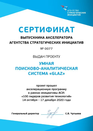 Проект умной поисково-аналитической системы «GLAZ» прошел акселерационную программу в рамках инициативы АСИ: «100 лидеров развития технологий»